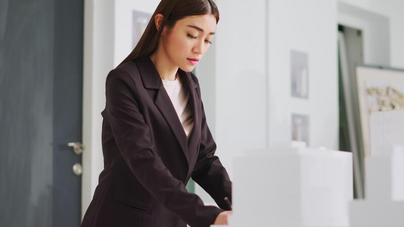 Engineers team analyzes 3d printed model to calculate dimensions, working together on unicorn business development plans. Women architects creating blueprints with measurements. Tripod shot. Pro Video