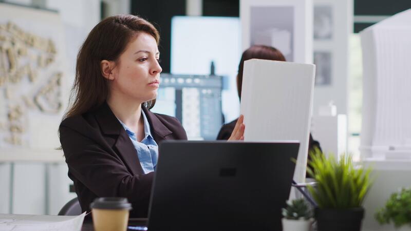 CAD specialist working with 3d printed maquette model to generate the perfect measurements and scales for property development plan. Architect using industrial tools for design. Handheld shot. Pro Video