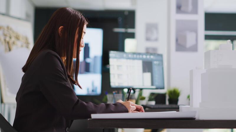 Engineers seek to establish designs for future building location, collaborating to sketch outlines and draw structural blueprints for project. Experts check 3D printed models. Handheld shot. Pro Video