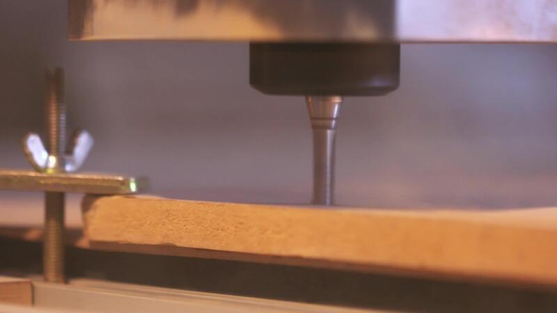 Close-up of wood cutting machine controlled by computer while he is carving wood. Action. CNC milling machine carving a wooden part blank. Pro Video