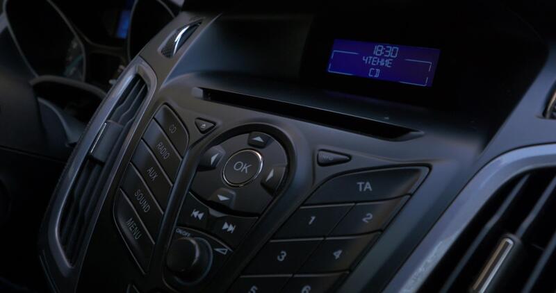 Man's hand puts the disk into the car player. Button control for compact disk player in a car. Hand puts the disk into the radio car Pro Video