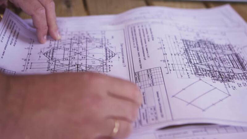 Close up for hands of workers at a factory looking through technical drawings. Blueprints with sketches of projects, engineering concept. Pro Video