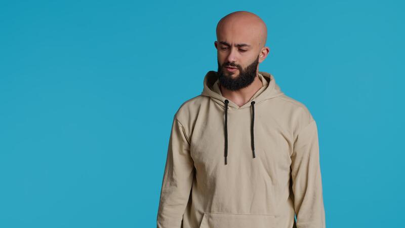 Young guy gesturing no sign over studio background, posing in studio and showing negative emotion. Middle eastern model doing forbidden gesture, expressing his refusal. Camera 1. Pro Video