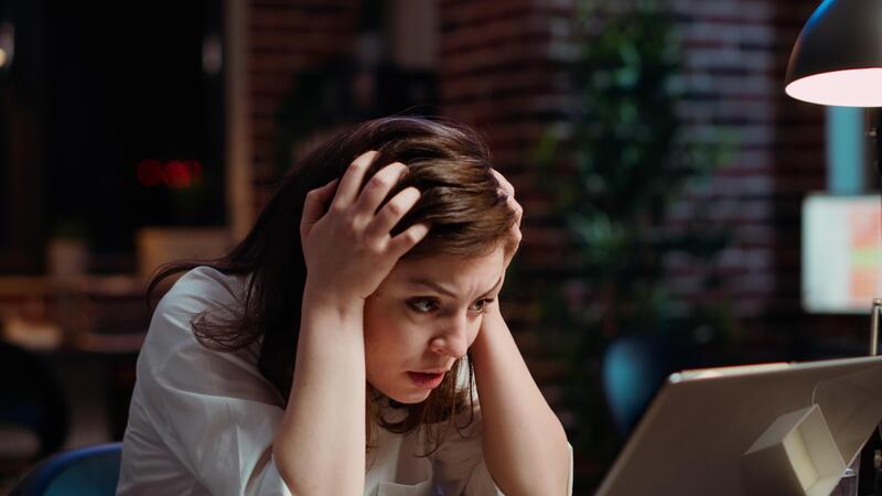 Worker frustrated by mistake she made while inputting data on laptop while working on company project overnight. Close up shot of upset businesswoman realizing error she made Pro Video