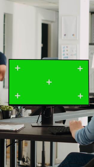 Vertical video Businesswoman looking at greenscreen display to work on agency tasks, employee analyzing isolated chromakey template at desktop. Person working with copyspace, problem solving. Pro Video