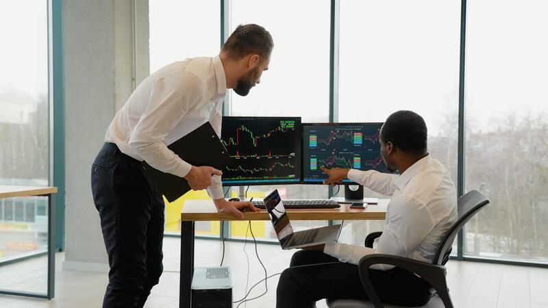 Two diverse traders, brokers in formalwear working using computers in the office Pro Video
