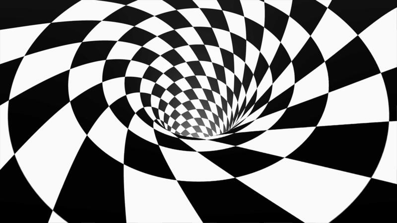 Animated hypnotic tunnel with white and black squares. Striped optical illusion three dimensional geometrical wormhole shape pattern motion graphics. Optical illusion created by zoom in of black and Pro Video