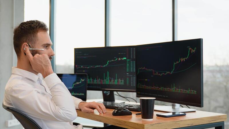 Concentrated crypto trader sitting in front of computers, making professional analysis of candlestick chart, creating strategy Pro Video