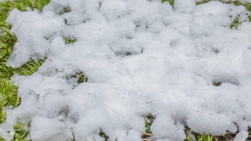 Macro time-lapse shot of shiny particles of melting snow and open green grass and leaf. Change of season from winter to spring in the forest. Pro Video