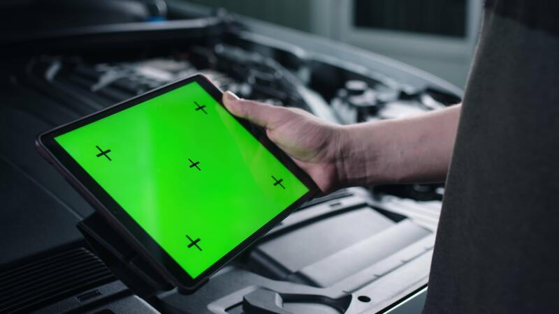 Worker, auto mechanic touching chroma key computer pad while doing engine diagnostics. Unrecognizable person using mockup tablet. Pro Video