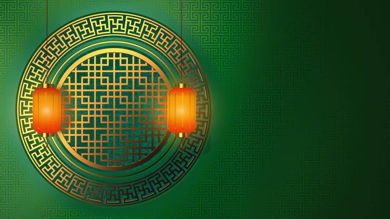 CHINESE LUNAR NEW YEAR ABSTRACT BACKGROUND WITH ORIENTAL GREEN AND GOLD ROUND WINDOW AND ROTATING LANTERNS LOOP ANIMATION Pro Video