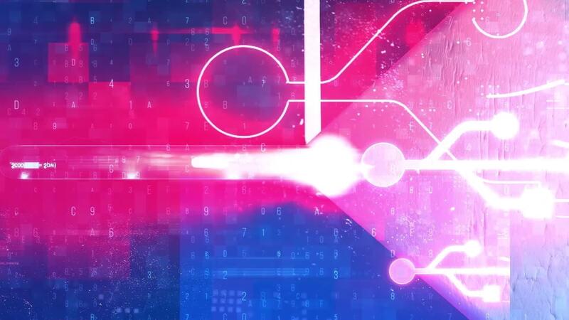 USB flash card with red glow inserted in the laptop on cyber icons background. Abstract animation with the flash memory device being put in the computer. Pro Video