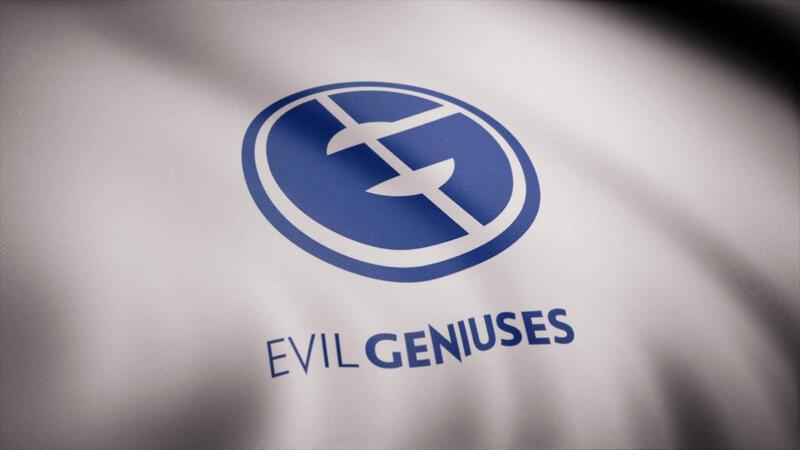 Cybergaming Evil Geniuses flag is waving on transparent background. Close-up of waving flag with Evil Geniuses cybergaming logo, seamless loop. Editorial animation