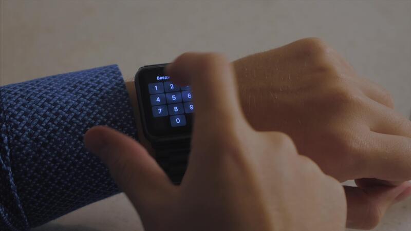 Man hand in watch with program on the screen against the background of table. Man hand at the home with watch and app on the screen. Modern smart watch with cloud of apps Pro Video