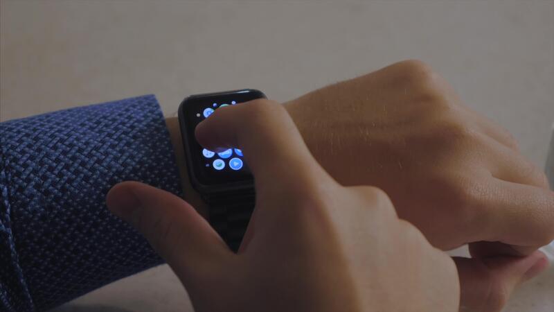 Man hand in watch with program on the screen against the background of table. Man hand at the home with watch and app on the screen. Man working with smart watch in office Pro Video