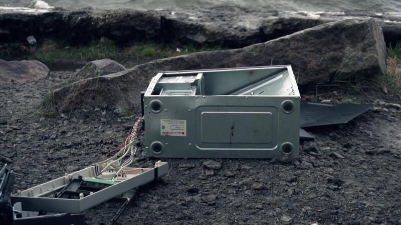 Man breaks a computer with a sledgehammer. A man destroys a computer on the street. The concept of the dangers of technology Pro Video
