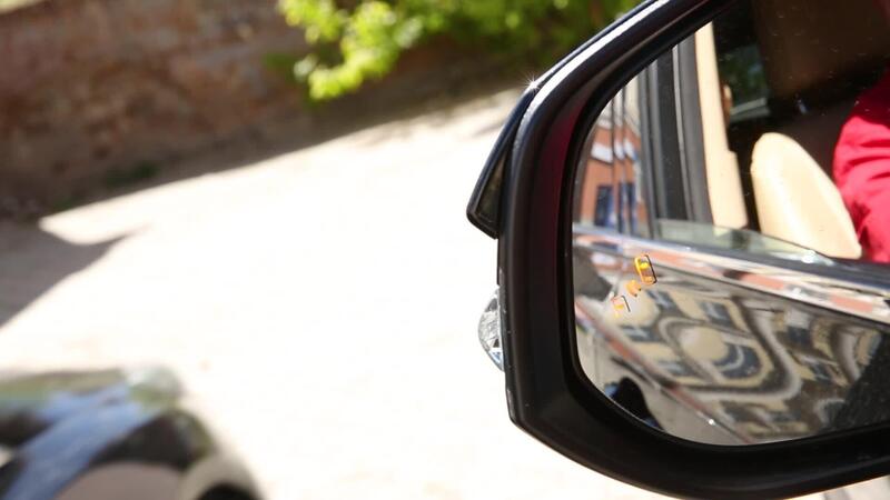 Blind Spot Monitoring system warning light icon in side view mirror of a modern vehicle. system blind spots of the car Pro Video