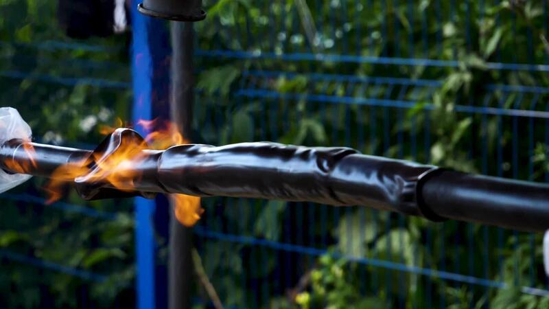 Blowtorch. Frame. Close-up of work with blowtorch on street on background of trees. Roasting of pipes with gas burner Pro Video
