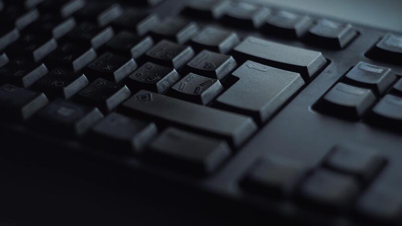 Close-up man presses keyboard key. Man presses button enter computer keyboard. Man's hand presses keyboard in light of computer screen Pro Video