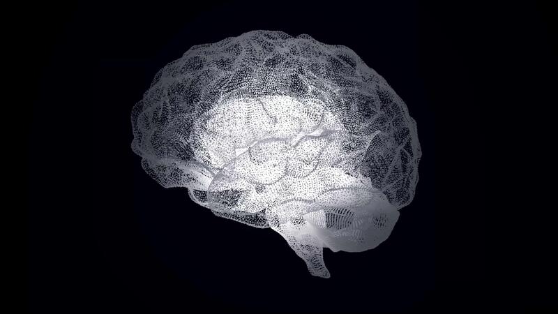 Abstraction of human brain structure on black background. Futuristic scientific and technical brain connections in roentgen. Interlacement of connections in brain in rotating motion. Concept of Pro Video