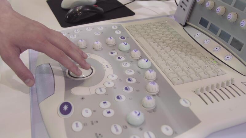 Man working for a new computer with a futuristic panel. New computer technologies Pro Video