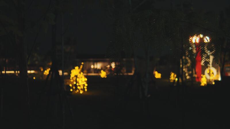 Blurry night scene with indistinct illuminated figures and trees, creating a mysterious and moody atmosphere. Pro Video