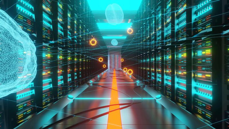 Concept of data center with AI learning. Big data. 3D render animation of computer and AI learning machines Pro Video