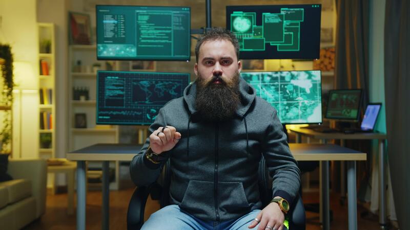 Bearded hacker doing hand gestures using augmented reality while breaking a firewall. Pro Video