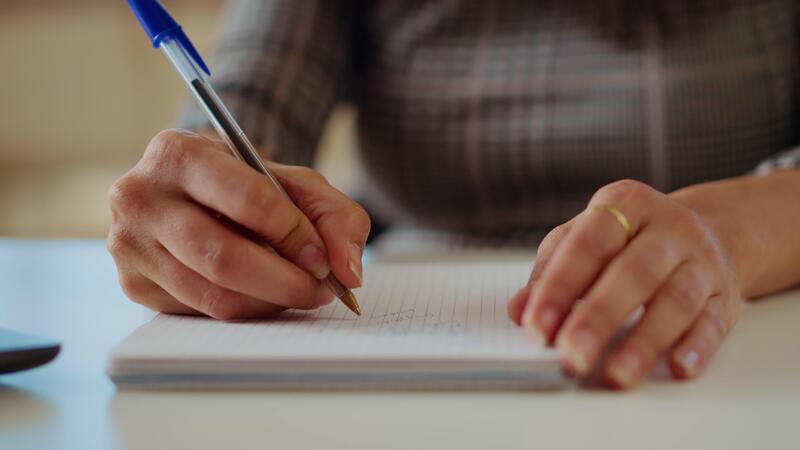 Teleworker at desk transcribing data from laptop to notepad, finalizing project. Remote worker solving job tasks before deadline, writing info on paper using pen, camera B close up shot Pro Video
