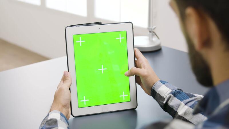 Man working on a digital tablet PC with green screen on it. Zoom in parallax shot Pro Video