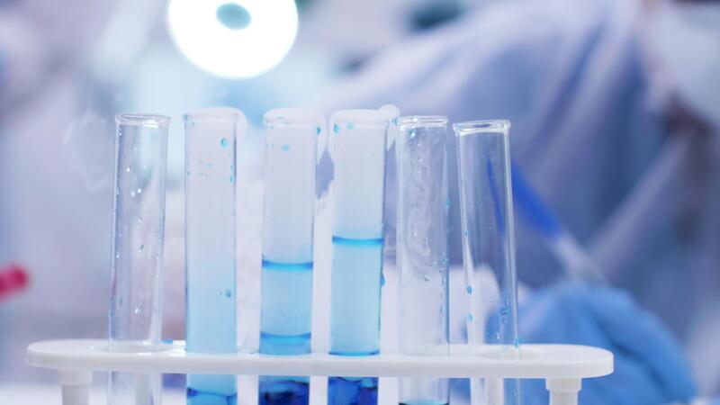 Close up of scientist adding solution with pipette on smoking blue fluid in test tubes. Chemist in research lab. Pro Video