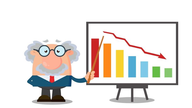 Professor Or Scientist Cartoon Character With Pointer Presenting A Falling Chart. 4K Animation Video Motion Graphics Without Background Pro Video