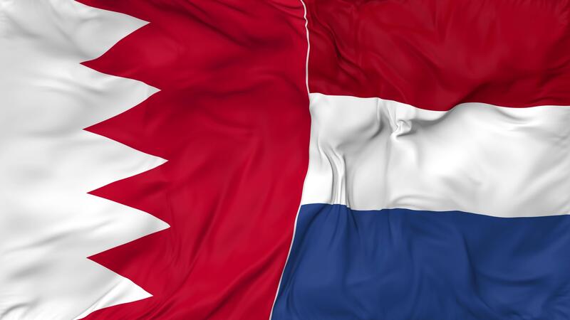 Bahrain and Netherlands Flags Together Seamless Looping Background, Looped Bump Texture Cloth Waving Slow Motion, 3D Rendering Free Video