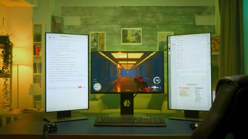 Room with professional gaming setup with powerful PC and multiple monitors with stream chats opened on them. Neon light. Pro Video