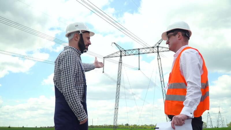 Two engineers working near transmission lines. Manager accepts a report on the operation of power lines Pro Video