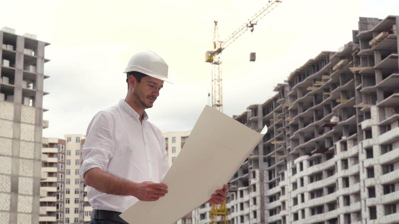 Architect or engineer working, browsing building project of construction site with blueprint plan Pro Video