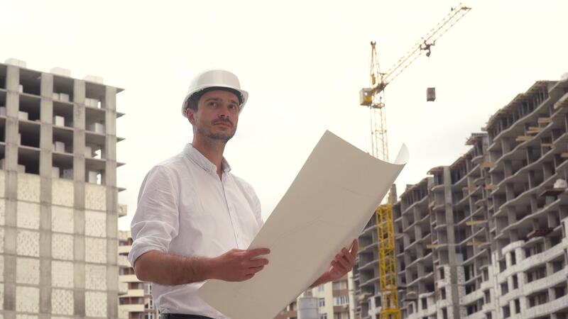 Architect or engineer working in hard hat browsing building project of construction site with blueprint plan Pro Video