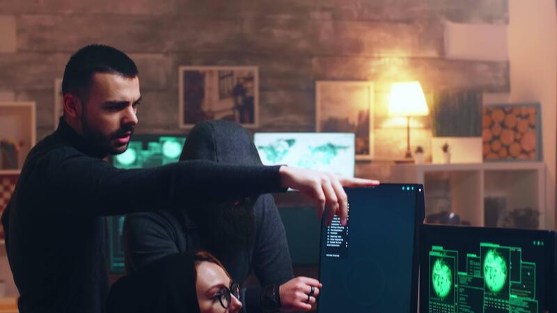 Team of hackers looking at computer with multiple monitors while committing cyber crimes. Pro Video