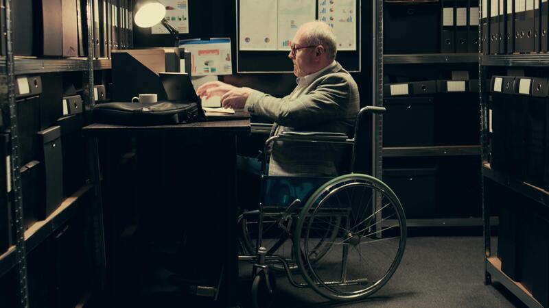 Paralyzed investigator does background check on potential culprit, gathering intelligence from old cases that match his profile. Agent working in disability friendly space to solve crime. Camera B. Pro Video