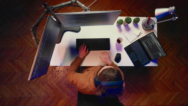 Top down shot of technician focused on typing complex code in home office, developing software application. It specialist removing headphones to better concentrate on difficult task, aerial shot Pro Video