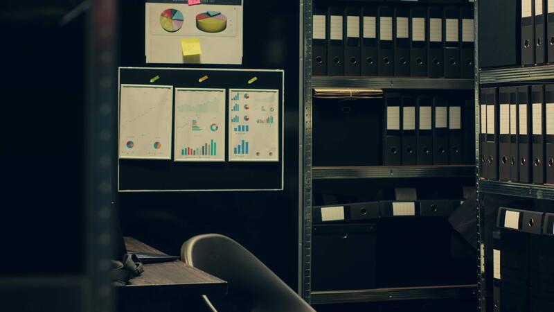 Legal advisor working on criminal private investigation in archive, studying old classified folders regarding interpretation of laws. Detective analyzing files to decipher coded messages. Camera A. Pro Video