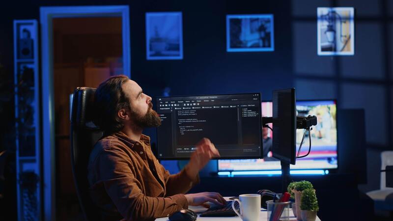 Software engineer doing programming using augmented reality visualization during remote job shift in home office. IT admin working on computer, looking at AR hologram, camera A Pro Video