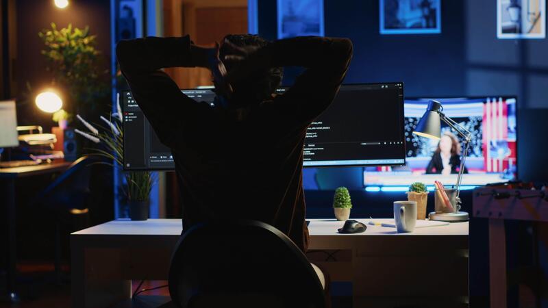 Man doing IT support job from home office, stretching after sitting on desk chair all day. Programmer loosening up, relaxing after typing on computer for long period of time, camera A Pro Video