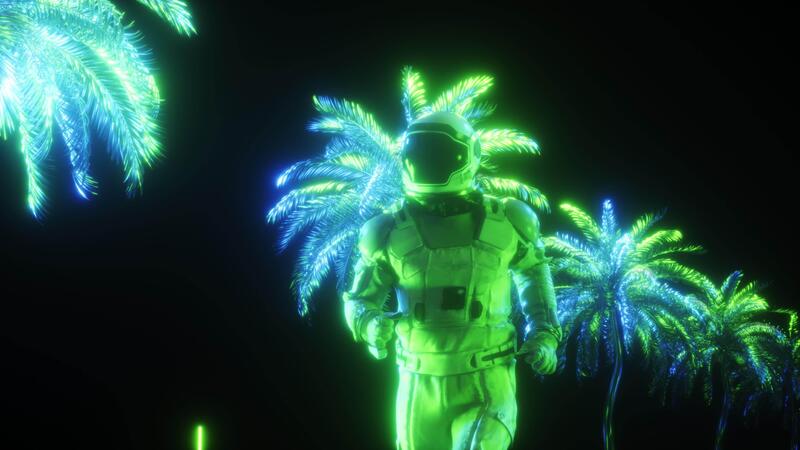 Synthwave Background of Running Astronaut Against Neon Glowing Palm Trees Loop Pro Video