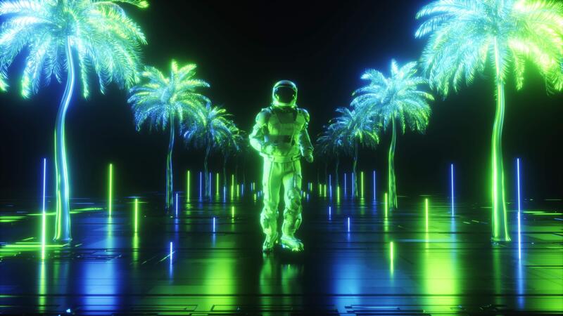 Synthwave Background of Running Astronaut Between Neon Glowing Palm Trees Loop Pro Video