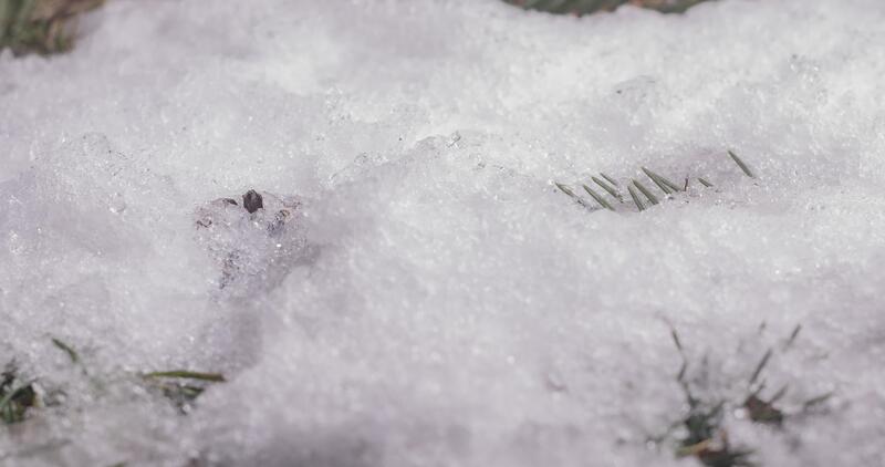 Macro time-lapse shot of shiny melting snow particles turning into liquid water and unveiling branch Christmas tree, pine cone and green grass. Change of season from winter to spring in the forest. Pro Video
