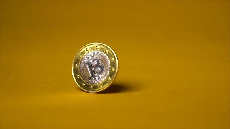 Macro shot of rotating bitcoins. Blockchain technology, bitcoin mining. Gold background. Slow motion Pro Video