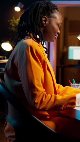 Vertical Video African american IT student practicing coding or programming exercises, learning hardware language and system debugging. Young woman studying database script on html window. Camera B. Pro Video