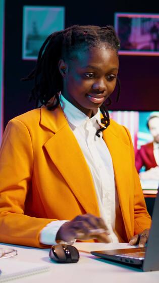 Vertical Video African american student communicating with professors and classmates on online class videocall, using academic web connection platforms. Girl participating in webinar college lesson. Camera B. Pro Video