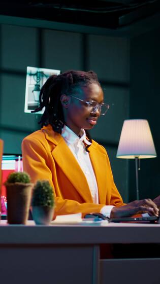 Vertical Video Hardworking girl studying business administration remotely, attending online classes and webinars on dedicated academic platform. College student researching for assignments and projects. Camera B. Pro Video